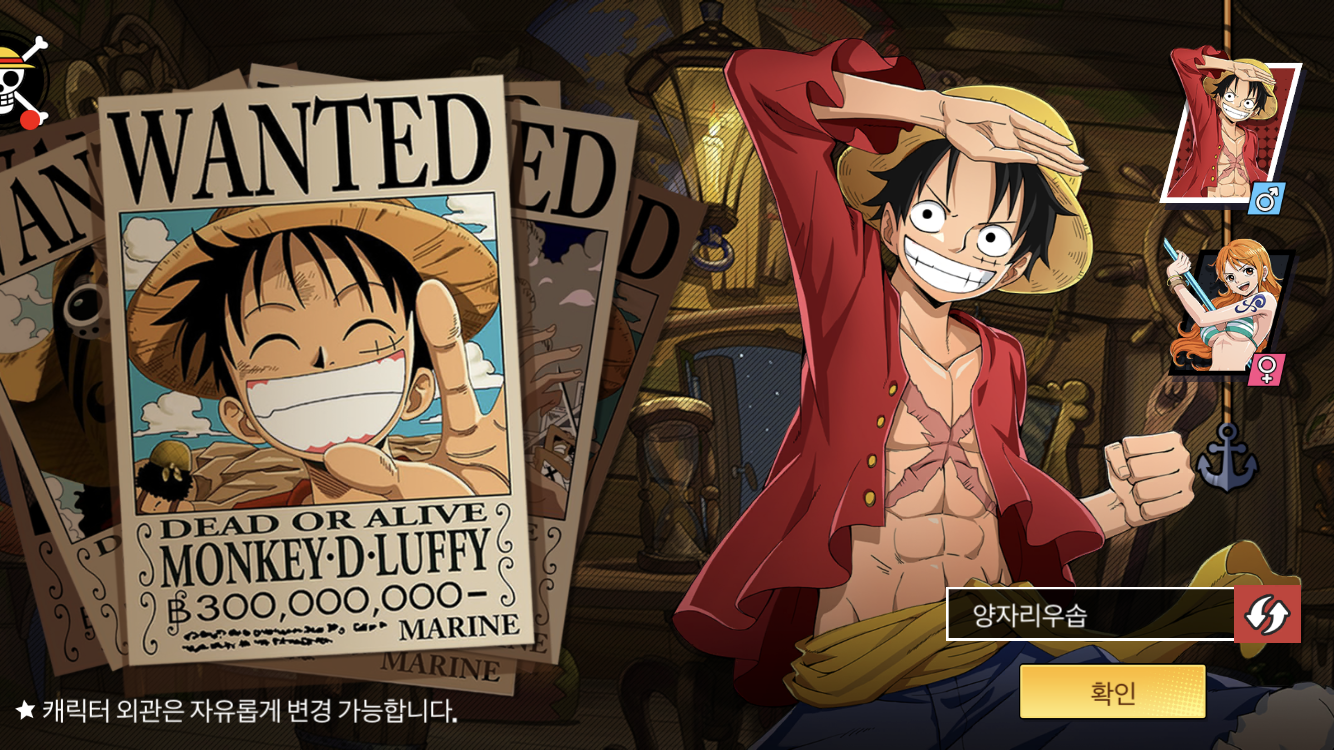 첫 시작할때 원하는 캐릭터로 시작하면 되는데 저는 해적단에 맞게 루피를 선택했고 나미랑 진짜 고민 많이 했던거같아요! 여자캐릭터냐 남자캐릭터냐 차이일뿐?