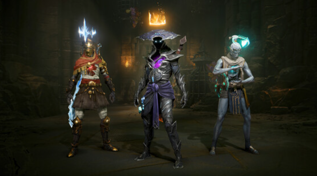 장비 칸은 4개예요. 유물 4개를 동일 세트로 모으면 이터널이라는 특별 캐릭터로 변신할 수 있고, 매 시즌 10명의 이터널이 준비돼요. 아이템 조합을 통해 새로운 플레이 스타일이 계속 파생되는 구조라 빌드를 배우고 변주하는 재미가 크다고 해요.