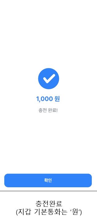 충전 완료 화면으로 금액이 반영돼요(지갑 기본 통화는 원).