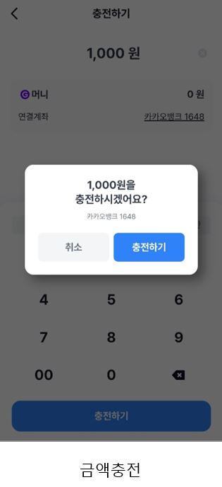 머니충전 메뉴에서 금액 입력 → 연결한 은행계좌로 충전.