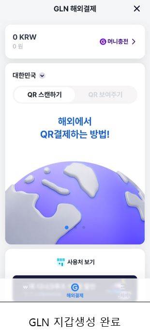 GLN 해외결제 홈이 열리면 지갑 생성이 끝난 상태예요.