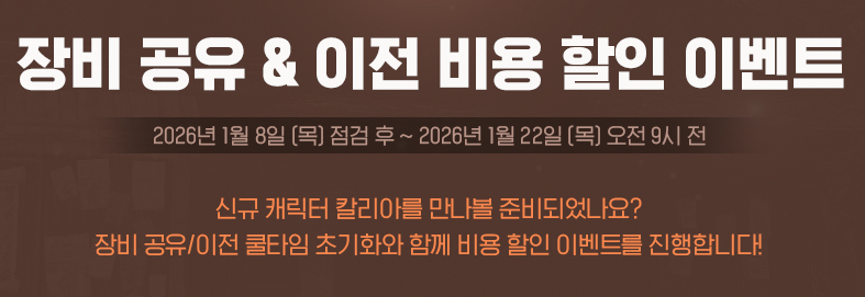 장비 공유 및 이전 비용 할인 이벤트는 1월 8일 점검 후부터 1월 22일 오전 9시 전까지 진행됩니다.