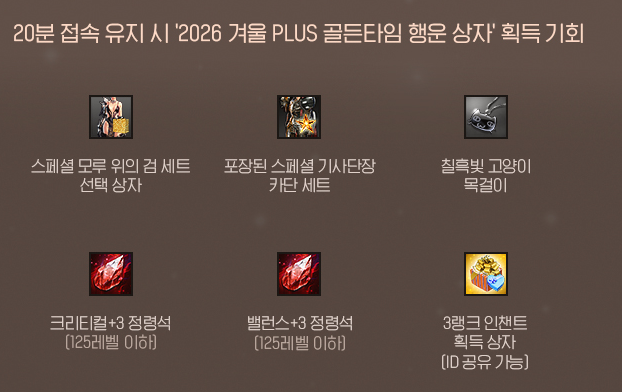 20분을 유지하면 2026 겨울 PLUS 골든타임 행운 상자 획득 기회가 생기며,