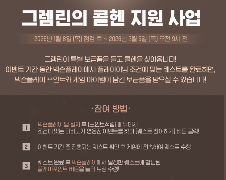 그렘린의 콜헨 지원 사업은 1월 8일 점검 후부터 2월 5일 오전 9시 전까지 진행됩니다.