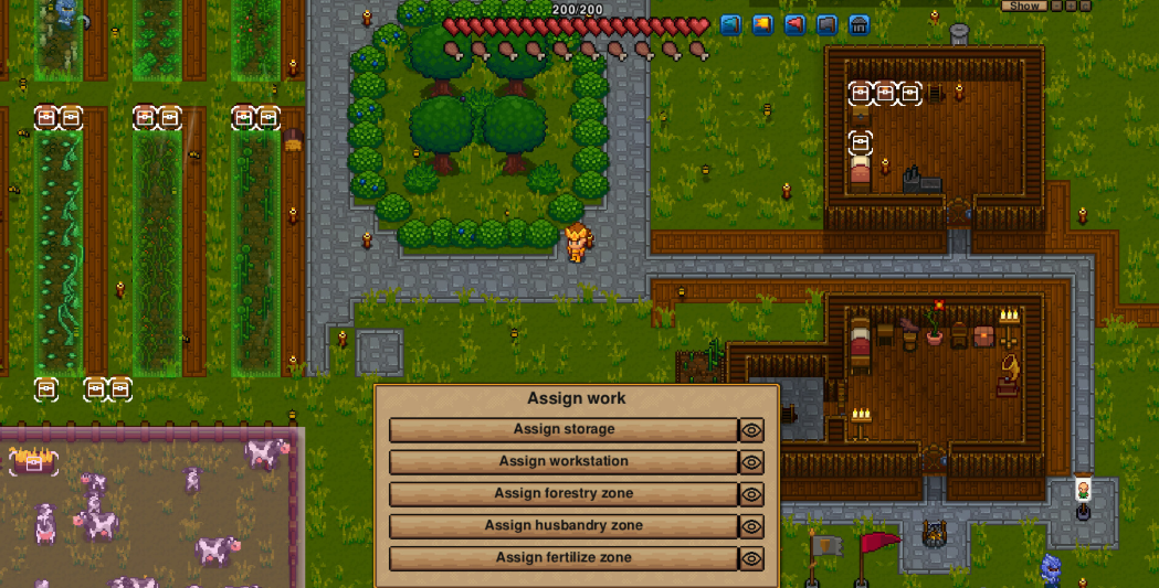 주민은 집과 음식이 필요하고, 작업도 배정할 수 있는데, 농사나 요리, 제작 같은 일을 맡기면 상자에 재료를 넣고 빼는 행동까지 이어집니다.
