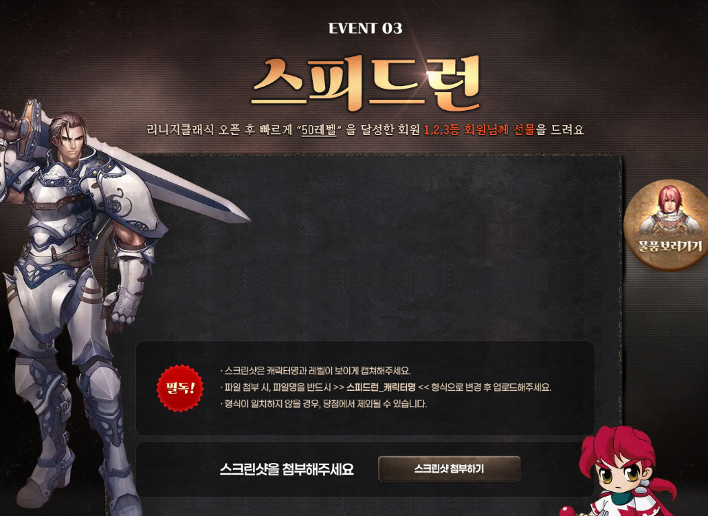 리니지 클래식 오픈 후 가장 빠르게 계정 50레벨을 달성하고 스크린샷 인증으로 참여하는 방식이에요.