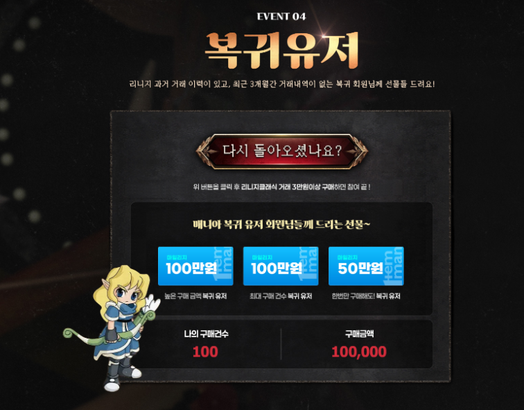 복귀 유저 대상 이벤트도 따로 있습니다.