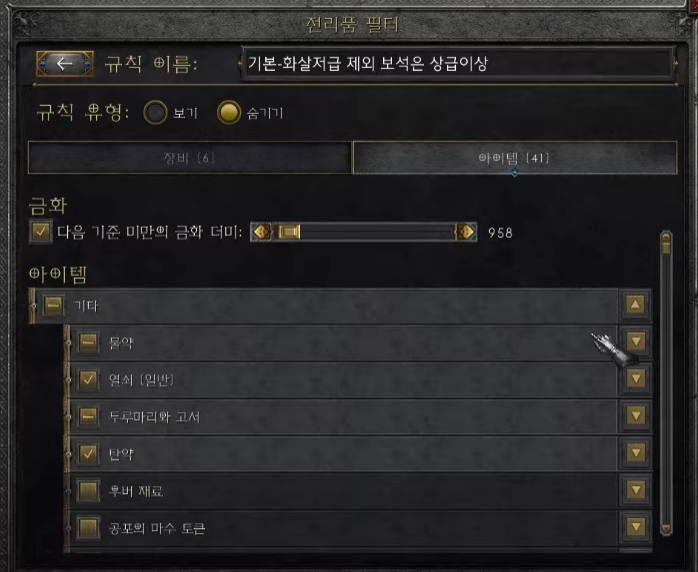 투척 물약은 끄고, 골드는 900 이상만 보이게 두는 쪽이 깔끔해요.