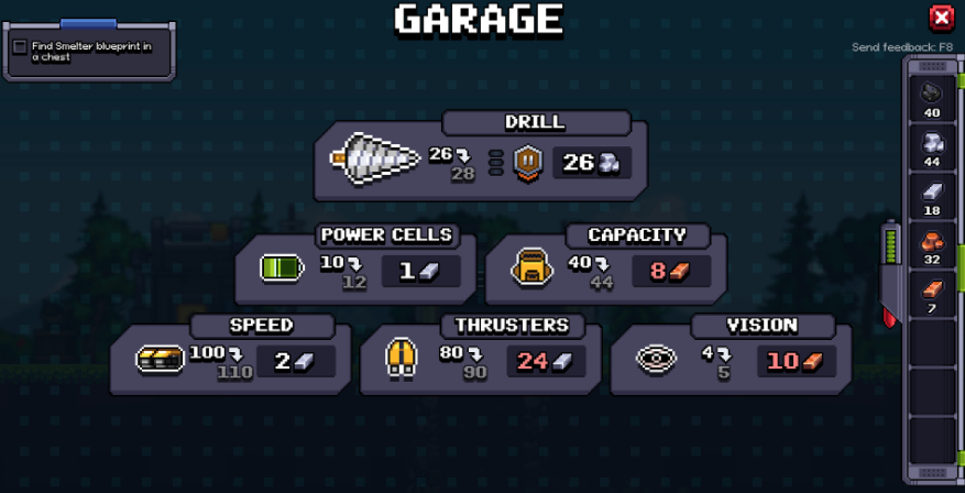 차고에서는 드릴, 배터리, 제트팩, 적재 용량 같은 성능을 올릴 수 있고, 바로 채굴 효율로 이어집니다.