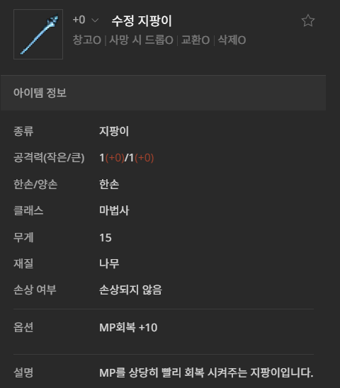 수정 지팡이는 엠탐할때 메디테이션키고 파랑 물약 먹고 수정 지팡이 착용해주면